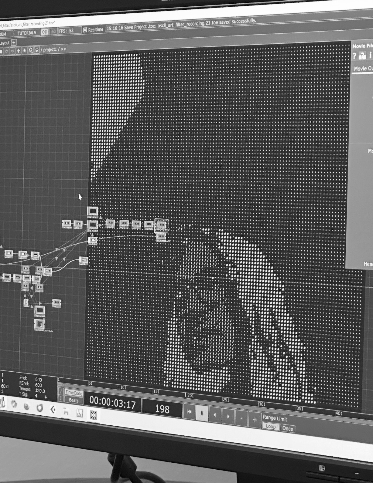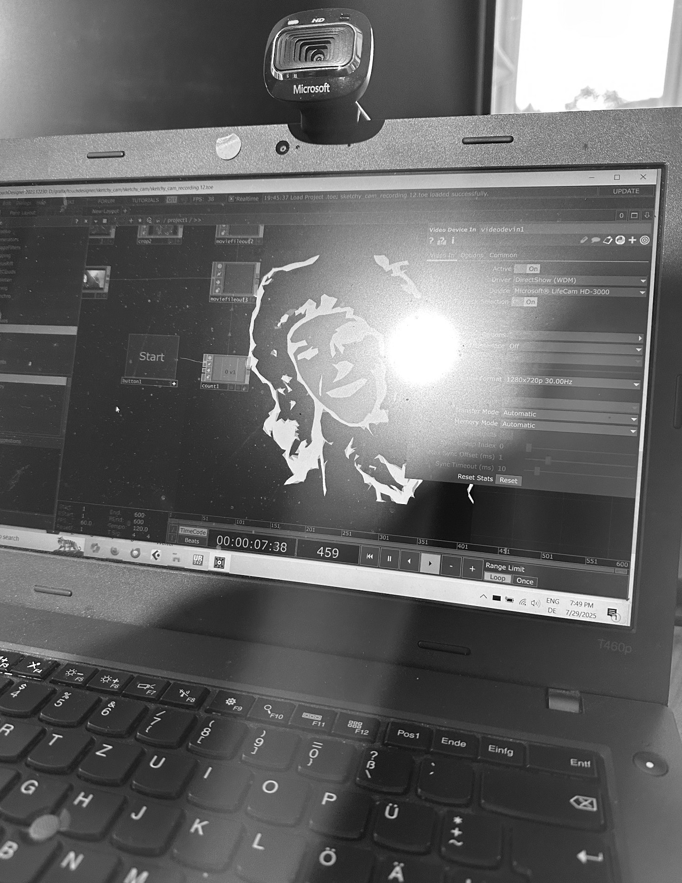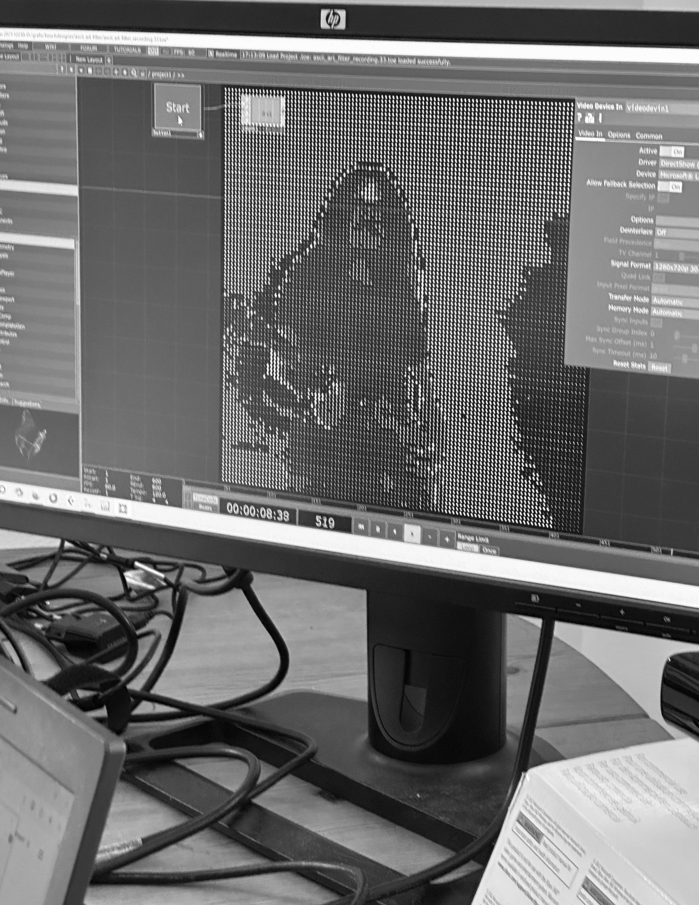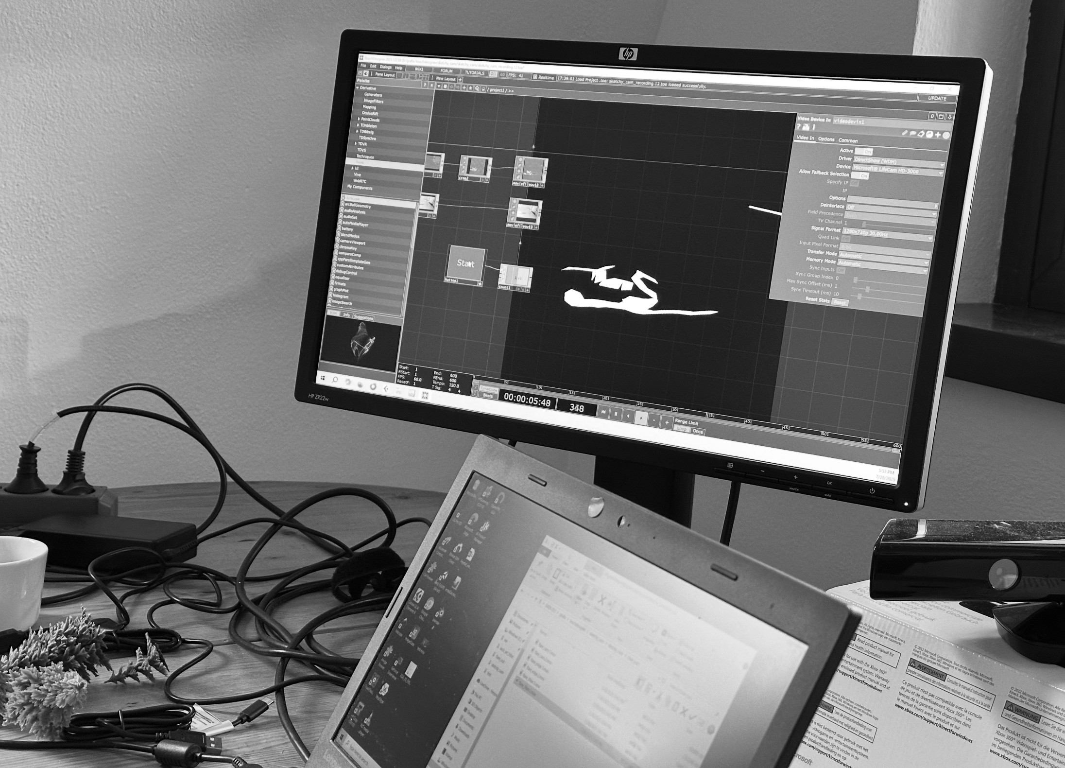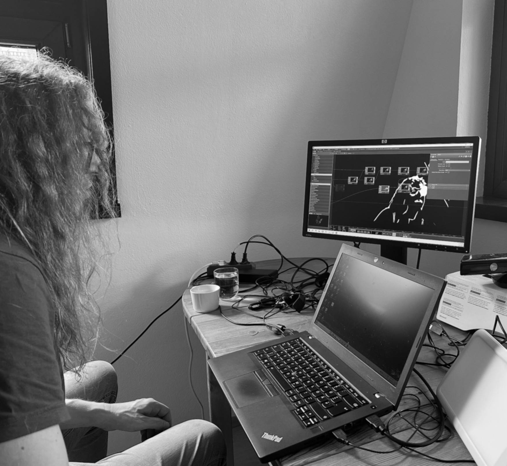 Volker had made his homework like an A-student. He showed me different options for visual filters he had been working on and that we could use for our music videos, and we chose two of them for starters. Using a web cam, we recorded live in TouchDesigner.