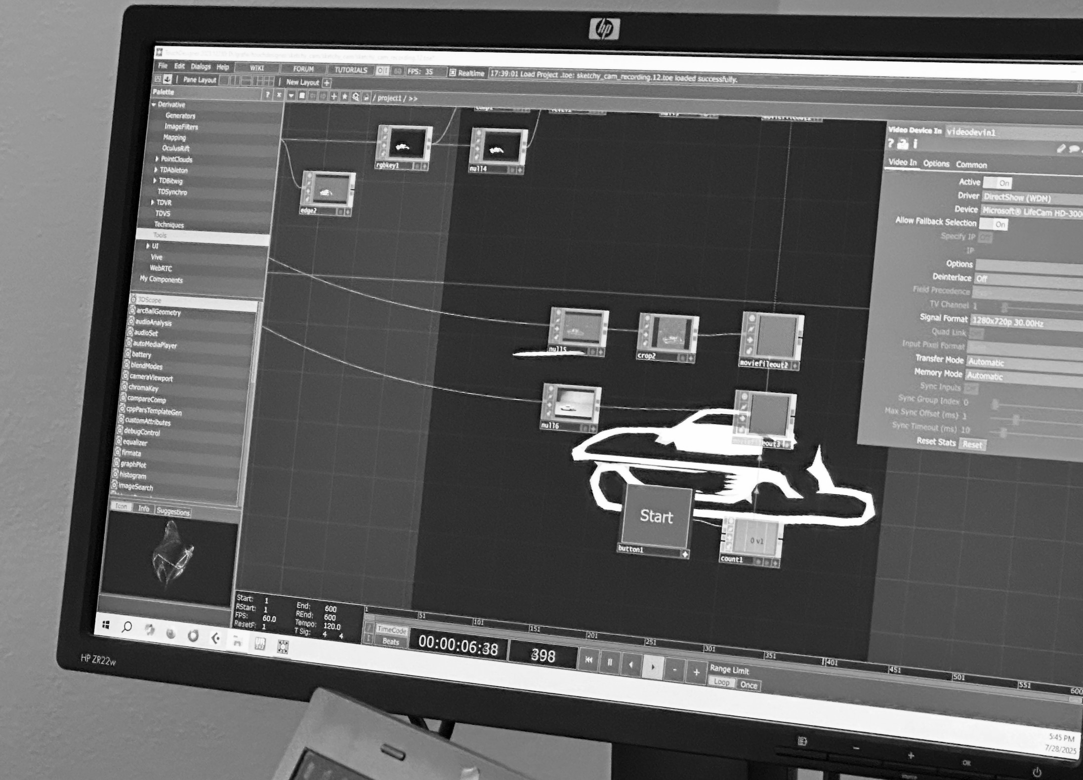Volker had made his homework like an A-student. He showed me different options for visual filters he had been working on and that we could use for our music videos, and we chose two of them for starters. Using a web cam, we recorded live in TouchDesigner.